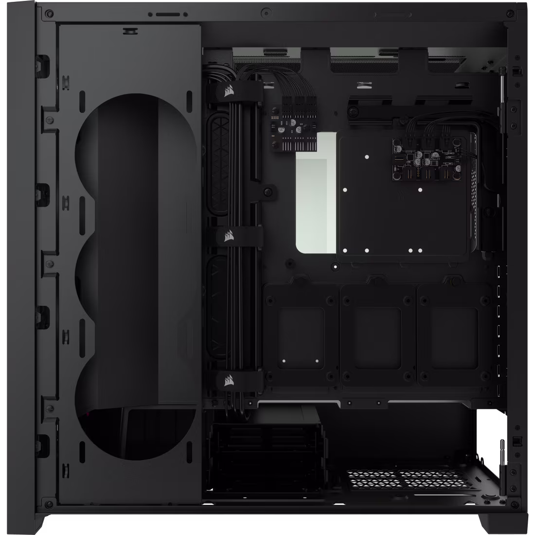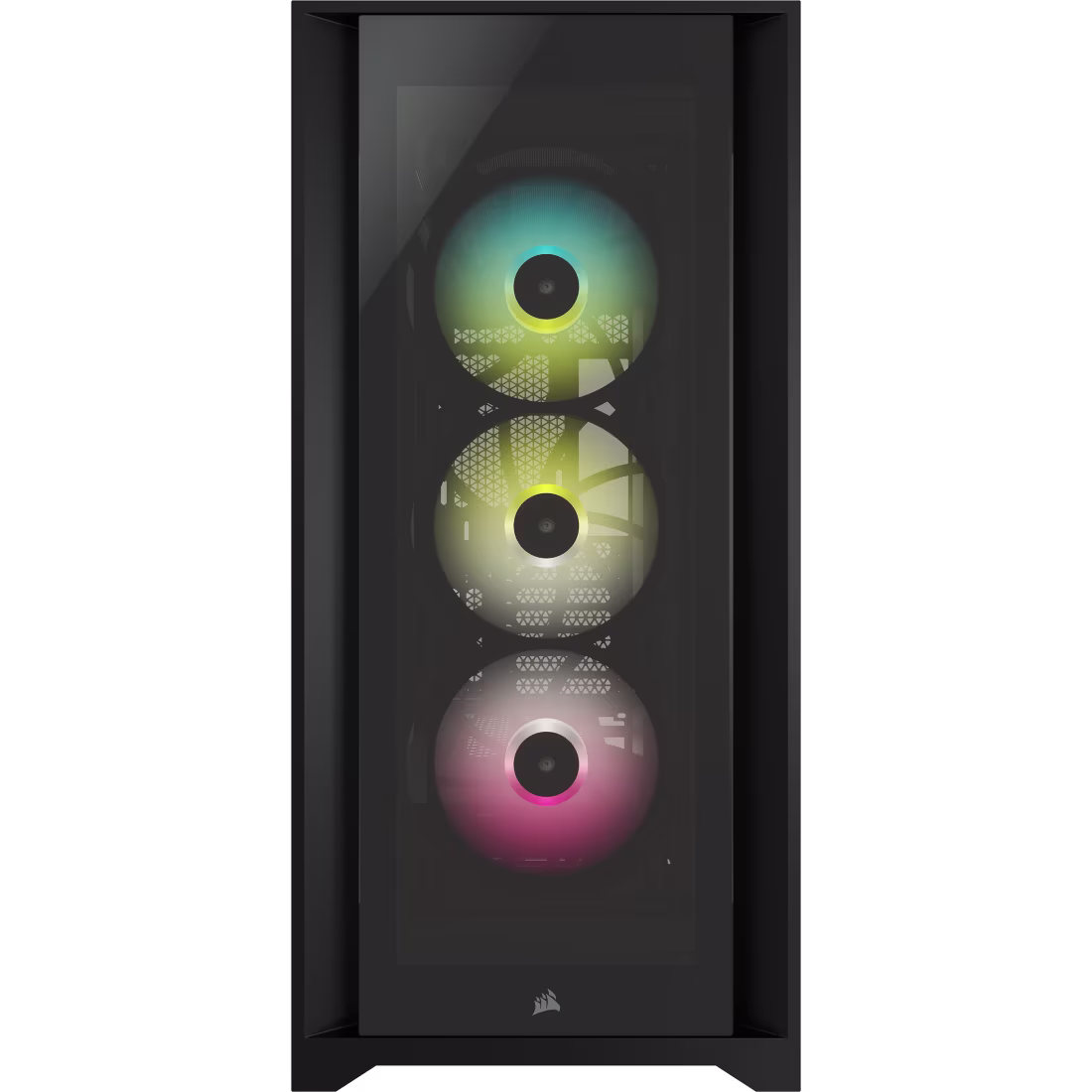 Key Features: 4 tempered glass panels, 3 RGB fans, iCUE lighting control, extensive cooling support, RapidRoute cable management, modern I/O, Black finish.